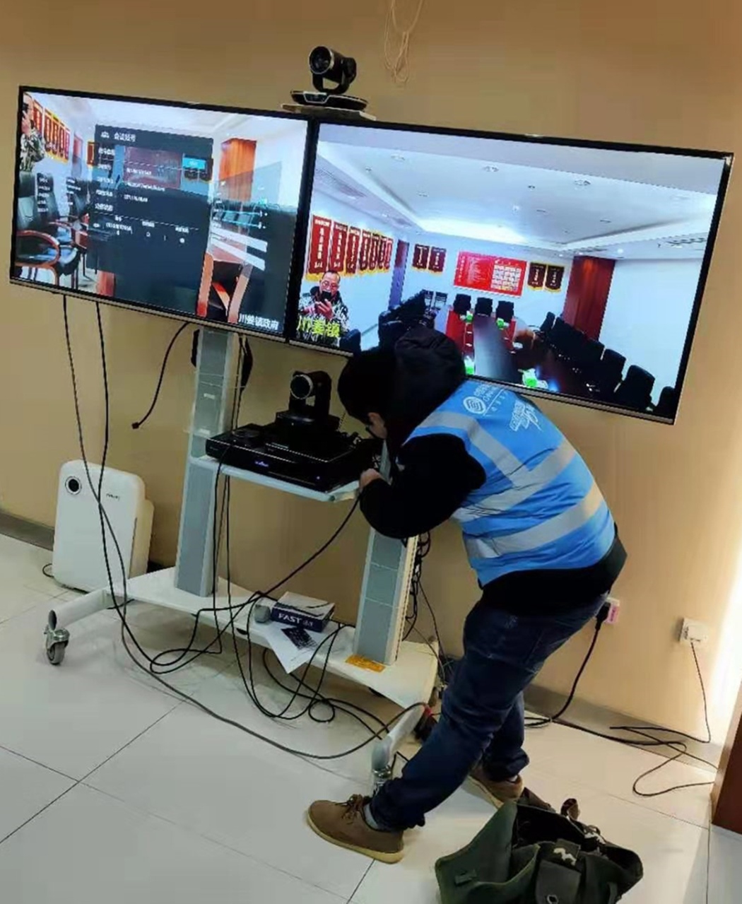 (移动工作人员为南通通州区政府紧急调试开通云视讯系统。)