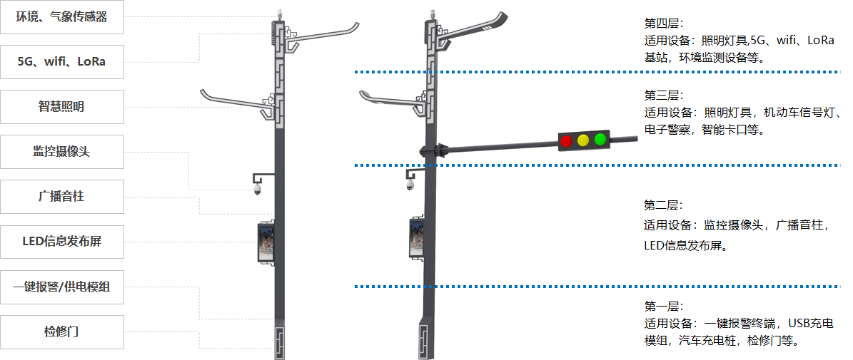 苏州移动遵循“多杆合一,一杆多用”原则,对新吴街交通信号控制、视频监测、标志牌等各系统与路灯照明进行合杆建设。有效解决了杆体众多、布网杂乱、资源数据无法统一等问题,改进了新吴街公众设施服务质量。