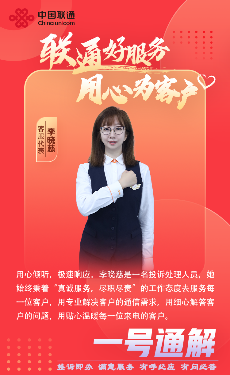 联通好服务 用心为客户,李晓慈是大连联通一名投诉处理人员,她始终秉着“真诚服务,尽职尽责”的工作态度去服务每一位客户,用专业解决客户的通信需求,用细心解答客户的问题,用贴心温暖每一位来电的客户。