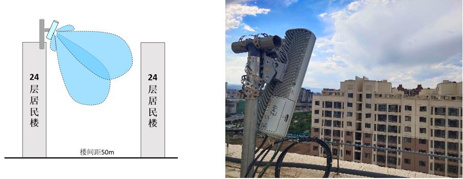 该小区站点使用电子下倾、宽窄波束相结合的部署方式,能够根据楼高、楼间距等实际条件,灵活调整波束下倾角度和宽度,最终实现居民楼全面覆盖。实测结果表明:整栋居民楼信号覆盖良好,近点5G下行峰值速率达1.2Gbps 下行平均速率510Mbps,极大节省建网成本的同时一步实现高层居民楼网络覆盖。